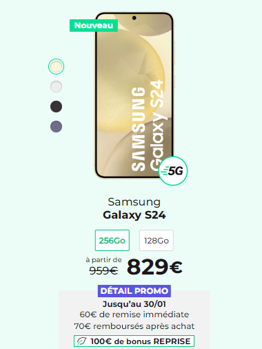 Le deal est simple à comprendre ? Pour toute souscription d’un forfait RED jusqu’au 30 janvier 2024, une remise immédiate de 60 € est accordée sur le Samsung Galaxy S24 256 Go ou 128 Go. Cette réduction est ensuite complétée par un remboursement de 70 € après achat. Avec un rabais total de 130 €, vous ne débourserez donc que 829 € au lieu de 959 € pour vous offrir votre téléphone dernier cri.