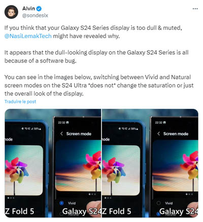 Effectivement, d'après nos propres tests sur le Galaxy S24 Ultra que nous venons tout juste de recevoir de la part de la marque pour réaliser un test complet, nous n'avons pas constaté de différence d'affichage entre les modes Naturel et Vif.
