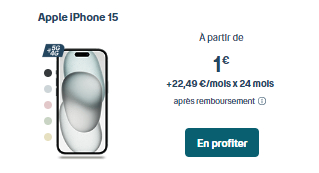 En optant pour le forfait 200Go de Bouygues Telecom, vous profitez d'une remise immédiate de 50€ sur le prix de votre iPhone 15. Pour augmenter le montant de vos remises, vous pouvez également faire reprendre votre ancien téléphone mobile, ce qui vous offrira la possibilité de bénéficier jusqu'à 100€ de réduction en différé.