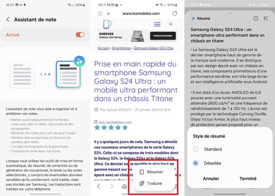 Galaxy AI se distingue par plusieurs fonctionnalités remarquables, telles que la traduction en direct de textes et d'appels, la création de résumés intelligents de textes, de notes et de pages web, la transcription et le résumé d'enregistrements vocaux, l'assistance à la rédaction dans les applications de messagerie et de communication.