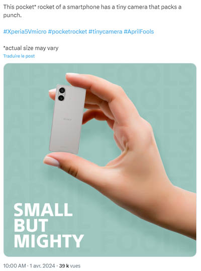 Sur le même principe, à croire que les marques se sont consultées avant de publier leurs fausses annonces, Sony a aussi profité du réseau X pour annoncer la prochaine commercialisation d’un smartphone aux dimensions réduites. Baptisé Xperia 5 V micro, celui-ci reprend les lignes du Xperia 5 V dans son format 21:9, tenant dans la main. Le Tweet mentionne : « Small package. Big Impact » et indique que l’appareil est doté d’un petit appareil photo qui a « du punch ». Pourquoi pas !