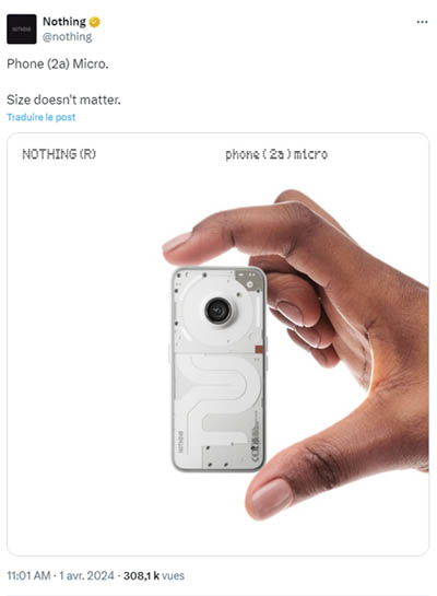 Le 1er avril est historiquement le jour où on colle des poissons dessinés dans le dos des personnes qu’on aime bien et où on peut faire un max de blagues. Cette année, comme les précédentes, les marques s’en sont donné à cœur joie. Ainsi, sur le réseau social X, Nothing a annoncé la sortie d’un nouveau smartphone à la taille riquiqui. Baptisé phone (2a) micro, ce mobile propose un design similaire au phone (2a) de la marque, mais avec des dimensions bien plus petites. Le tweet mentionne : « Size doesn’t matter » signifiant que la taille n’est pas ce qui compte sous-entendu, ce qui est important, c’est ce qu’on met dedans.
