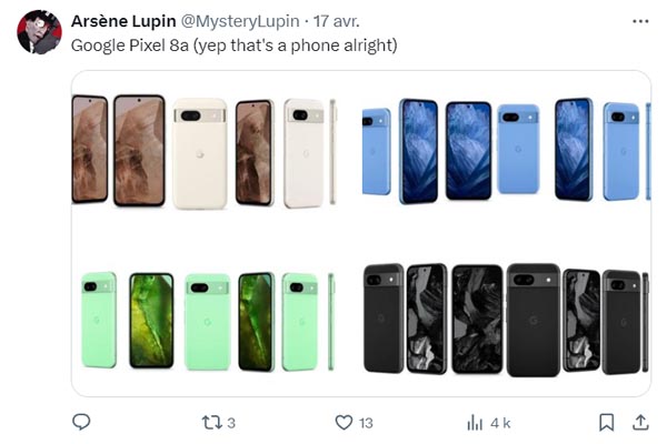 C’est le mystérieux @MysteryLupin qui a posté un message sur le réseau social X présentant le Pixel 8a sous tous les angles et dans tous les coloris. Le smartphone serait donc proposé en Obsidian, Mint, Porcelain et Bay, ajoutant ainsi un bleu vibrant et un blanc cassé à sa gamme.