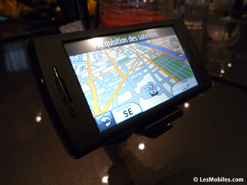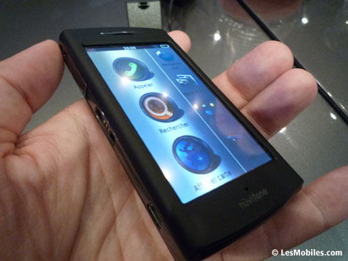 Equipé d'un écran tactile de 3,55 pouces, le smartphone 3,5G affiche les trois icônes principales : « Appeler », « Rechercher » et « Afficher la carte ». L'utilisateur accède aux autres icônes en glissant le doigt sur l'écran, et l'accéléromètre intégré permet d'afficher toute l'interface en mode portrait ou paysage.