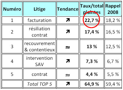 Ce TOP 5 qui représente près de 65% des plaintes présente les mêmes items avec le même classement que l'an passé. La concentration des plaintes sur ces 5 litiges est plus forte que l'an passé. Le litige « facturation » est en hausse pour la deuxième année consécutive. On notera qu'il « gagne » 4,5 points par rapport à 2008.