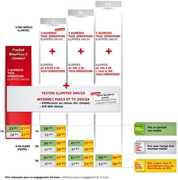 Par ailleurs, ces nouveaux forfaits (et Illimythics Absolu) sont compatibles avec les formules éco-avantage pour les clients souhaitant conserver leur mobile en rejoignant ou restant chez SFR : une remise leur sera alors attribuée, jusqu'à 10 ? par mois, et avec les Multi-Packs de SFR, permettant aussi des réductions mensuelles, jusqu'à 15 ? par mois. Ces remises sont cumulables entre elles, ainsi qu'avec les promotions « spécial Noël ».