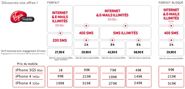 Une semaine après l'annonce officielle, les iPhone sont bel et bien arrivés chez Virgin Mobile !Les clients qui choisiront le forfait 6h à 58,90? /mois pourront donc acheter l'iPhone 4 16 Go au prix de 149? quand les opérateurs historiques (Orange, SFR et Bouygues Telecom) le proposent plutôt aux alentours de 200?. Un forfait sans voix est également disponible et permet d'acquérir l'iPhone 4 au prix imbattable de 99? !