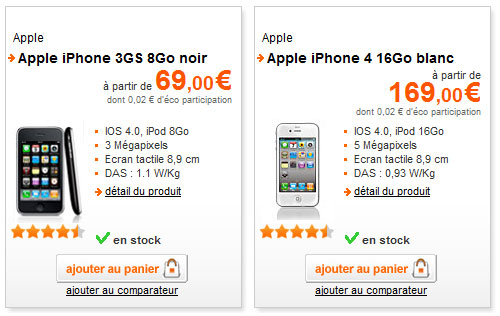 Avec l'arrivée de l'iPhone 4S, les opérateurs cherchent à écouler leur stock sur les anciens modèles en révisant leurs prix à la baisse. Orange propose donc désormais l'iPhone 4 16Go à 169 ?. La version 32Go s'affiche à 349 ?. L'iPhone 3GS 8 Go passe quant à lui à 69 ?.