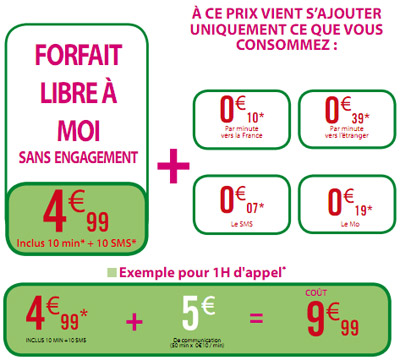? Forfait « Libre à moi » 10 min. + 10 SMS : 4,99? /mois (avec la minute supplémentaire facturée à 0,10?)