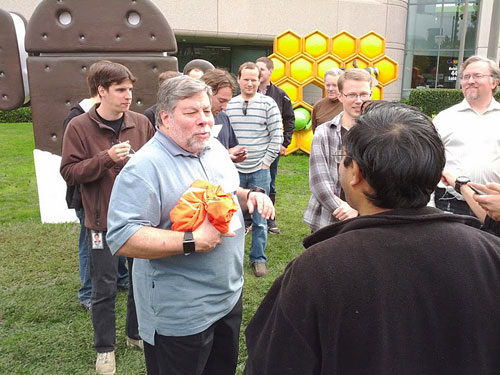 Là, Woz a reçu en cadeau le tant convoité Samsung Galaxy Nexus, ainsi qu'un t-shirt à l'effigie du petit bonhomme vert? le pire ennemi de feu Steve Jobs.