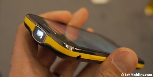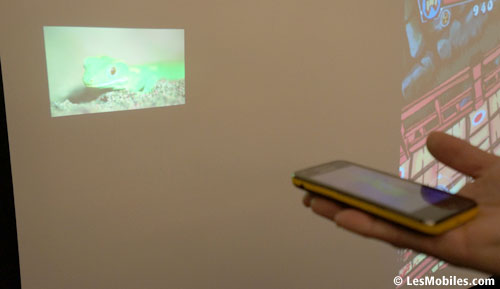 la projection est en effet commandée par un bouton physique, ce qui permet de projeter absolument tout ce qui apparait sur l'écran, et pas seulement des photos ou des vidéos. Notez que la résolution de la projection est de 640 x 360 pixels, pour une luminosité de 15 lumens. Le constructeur promet trois heures d'autonomie en mode projection. Il faut dire que la batterie de 2000 mAh est plus grosse que celles que l'on trouve habituellement dans les smartphones.