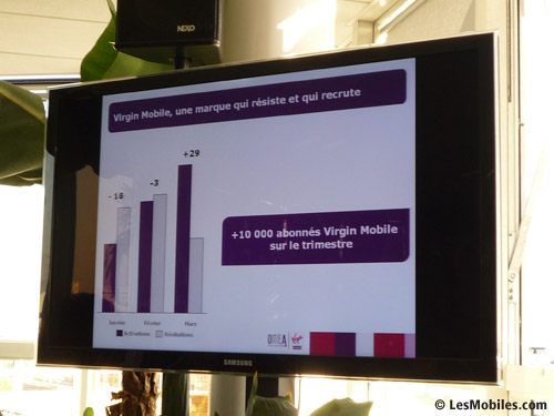 Quant à Virgin Mobile, pour lequel le Président d?OMEA TELECOM a déclaré ne pas avoir en tête le chiffre exact de clients (sic), la marque résiste plutôt bien, et parvient même à recruter sur les trois premiers mois de l'année. En effet, après avoir perdu 16.000 clients sur le mois de janvier, puis 3.000 sur le mois de février, Virgin Mobile a recruté 29.000 clients sur le seul mois de mars. Au total, le trimestre est donc positif pour la marque phare du groupe OMEA TELECOM, puisque Virgin Mobile a recruté 10.000 clients.