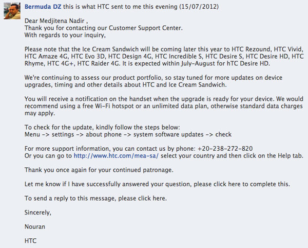 Comme vous pourrez le constater sur la première capture d'écran ci-dessous, l'opérateur précise que HTC l'a annulé en raison de mauvaises performances du smartphone sous Android 4.0 ICS. Mais le constructeur n'a pas mis longtemps à réagir puisque quelques heures seulement après la divulgation de cette information, HTC a répondu par le biais d'un message émanant du service client à un utilisateur qui demandait des précisions sur cette information sur le mur Facebook de la marque taïwanaise. Il est précisé dans ce message que la mise à jour Android 4.0 ICS est toujours d'actualité pour le Desire HD, et qu'elle est d'ailleurs attendue en juillet ou août, comme stipulé sur la seconde capture d'écran ci-dessous.