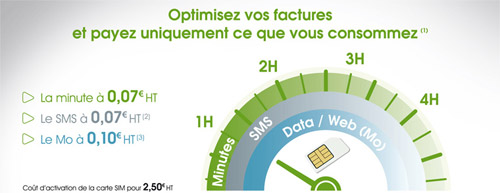 Les entreprises devront consommer au minimum par ligne l?équivalent de 10 ?/HT par mois, ce qui représente d'après l'opérateur une consommation de 1H30 + 30 SMS + 15 Mo dans le mois. Le coût d'activation de la carte SIM est de 2,50 ?/HT.