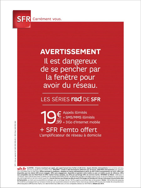 L'occasion pour SFR de lancer une nouvelle publicité avec le message : « Avertissement. Il est dangereux de se pencher par la fenêtre pour avoir du réseau. »