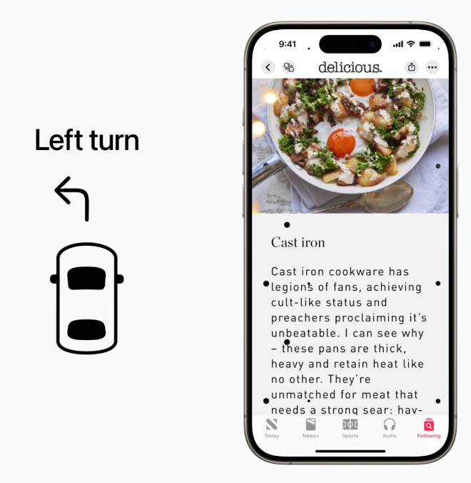Enfin, aussi pour un usage en voiture, l’application CarPlay propose des nouvelles fonctionnalités. Elles incluent le contrôle vocal, les filtres de couleur et la reconnaissance sonore. Avec le contrôle vocal, les utilisateurs peuvent naviguer et contrôler les applications CarPlay uniquement avec leur voix. La reconnaissance sonore permet aux conducteurs ou passagers sourds ou malentendants d'être alertés des klaxons et des sirènes. Pour les utilisateurs daltoniens, les filtres de couleur rendent l'interface CarPlay plus accessible, avec des options de texte en gras et d'autres améliorations visuelles.