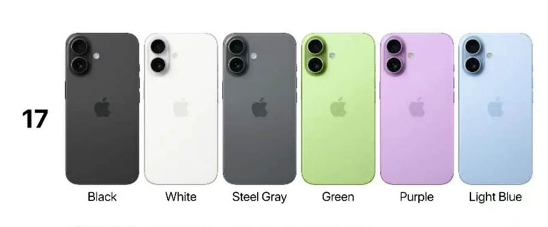 L'iPhone 17 de base proposerait six options de couleur, selon les informations confirmées par plusieurs sources. Cette palette comprend les classiques noir et blanc, rejoints par quatre nouvelles teintes : Steel Gray (Pantone 18-4005-TPG), vert (Pantone 2282 U), violet (Pantone 530 U) et bleu clair (Pantone 658 U).