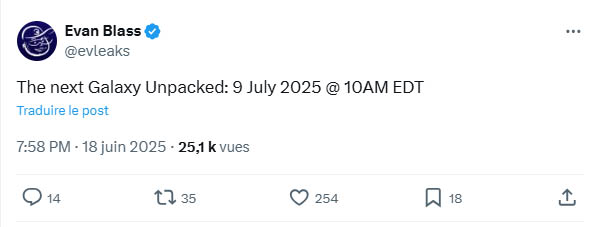 Samsung s'apprête à lever le voile sur sa nouvelle génération de smartphones pliants lors d'un événement Galaxy Unpacked programmé le 9 juillet 2025 à 10h EDT, selon les informations divulguées par le réputé leaker Evan Blass. Cette annonce, bien qu'officieuse, correspond à la tradition estivale de la marque qui présente habituellement ses appareils pliants durant cette période. Les Galaxy Z Fold6 et Galaxy Z Flip6 avaient effectivement été annoncé début juillet 2024. L'événement devrait se dérouler à New York, comme l'indique le fuseau horaire mentionné.