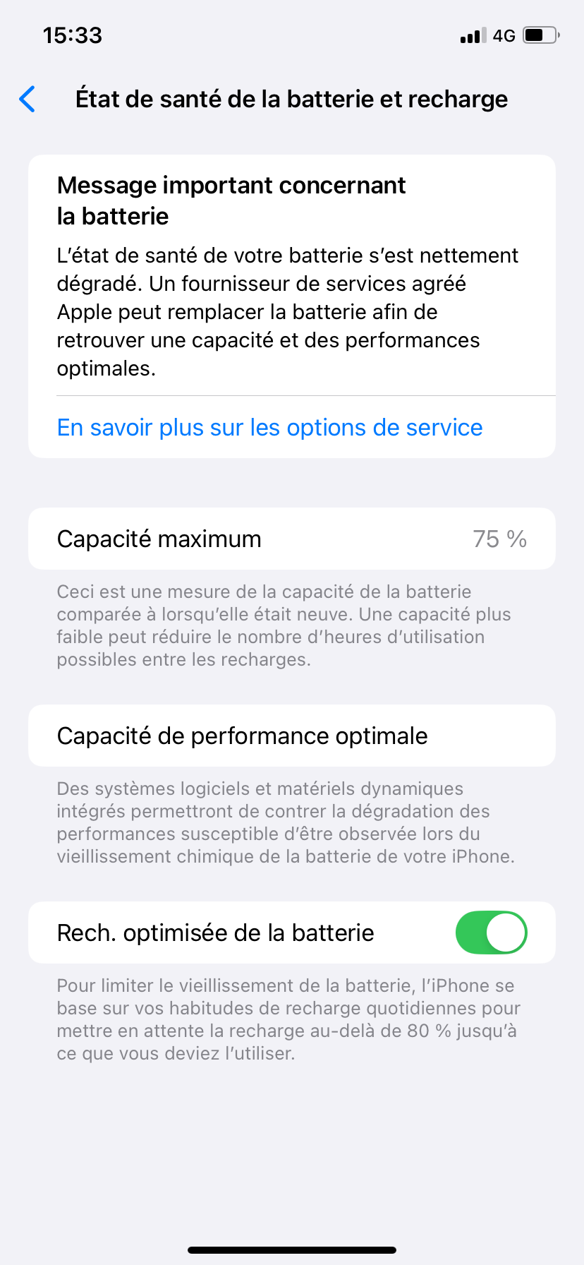 Il vous est possible de trouver un état des lieux de la santé de votre battre sous Android et IOS dans les paramètres :