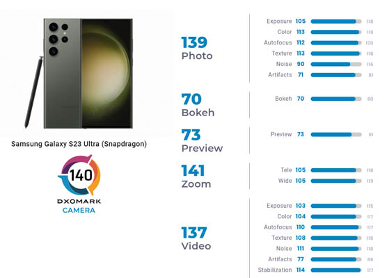 Enfin, le Samsung Galaxy S23 Ultra propose, toujours selon DxOMark, de très bons détails avec une plage dynamique assez large dans tous les conditions. Le zoom offre des détails et le laboratoire a apprécié l’efficacité de la stabilisation vidéo. En outre, la mise au point automatique est jugée précise aussi bien en mode photo que vidéo. Par contre, on peut lui reprocher un contraste faible dans les scènes à contre-jour ainsi que la production de bruit en basse lumière et en intérieur. Des détails peuvent être perdus sur les visages et quelques artefacts ont été constatés dans différentes conditions.