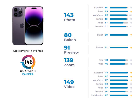 L’iPhone 14 Pro Max propose des couleurs agréables et vives en photo, mais aussi en vidéo ainsi qu’une large plage dynamique et d’excellents contrastes. On profite d’un haut niveau de détails ainsi que d’un excellent autofocus. L’effet bokeh simulé est agréable, proposant aussi un bon niveau de détail. Le zoom photo et vidéo continu est jugé de haute qualité à courte et à moyenne portée. Quelques coupures occasionnelles ont toutefois été constatées sur les hautes lumières, notamment dans le ciel ainsi qu’un peu de bruit de luminance pour les photos en intérieur.