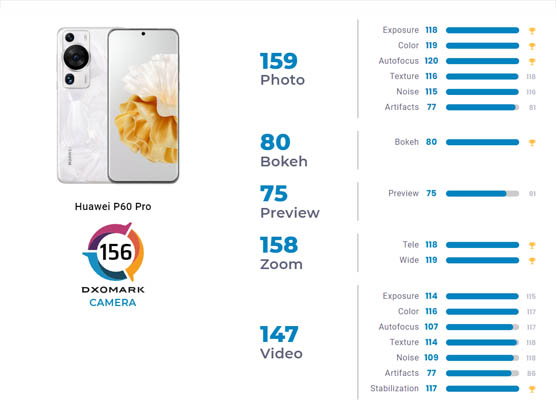 Le Huawei P60 Pro a été apprécié pour sa large plage dynamique pour les images de paysage et de portrait avec un bon contraste dans toutes les conditions d’éclairage. Selon DxOMark, il produit des photos avec des couleurs agréables et vives quelques que soient les situations. La mise au point automatique a été jugée rapide et précise et le laboratoire a aimé la profondeur de champ avec la netteté notamment sur les photos de groupe. Le niveau de détails est élevé et le bruit est maîtrisé. Le mode portrait produit de beaux effets de flou et isole précisément le sujet. On lui reproche des tons de peau peu naturels en vidéo en basse lumière et certains rendus de détails peu naturels aussi dans des conditions difficiles.