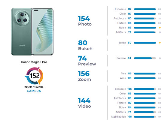 Le Honor Magic5 Pro a séduit par les qualités de son zoom ainsi que la large plage dynamique, le bon niveau de détail et le faible bruit sur les photos. La mise au point automatique a été appréciée, car jugée rapide et précise, tout comme les couleurs. La bonne exposition pour les photos de nuit a été notée ainsi que la très bonne isolation du sujet en mode bokeh. DxOMark lui reproche une profondeur de champ limitée pour les photos de groupe et les scènes complexes ainsi qu’un rendu parfois désagréable des visages et des teintes de peau parfois non naturelles. Il a été remarqué qu’il y avait une différence significative entre l’aperçu à l’écran et la photo produite, in fine.