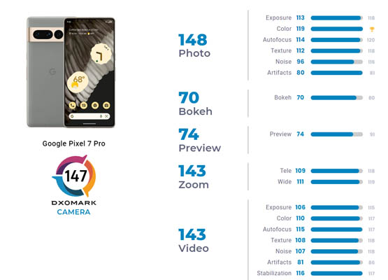 Le Google Pixel 7 Pro, pour sa part, propose de beaux tons de peau même dans des conditions difficiles. Il permet d’obtenir une exposition précise et une large plage dynamique aussi bien en photo qu’en vidéo. Selon DxOMark, la mise au point automatique est rapide et précise et le contraste est agréable, y compris pour les prises de vue à contre-jour. Le bon niveau de détail a été apprécié ainsi que la stabilisation jugée comme efficace et le bon niveau de détails à toutes les plages de zoom. Quelques bruits d’ombres dans les scènes à contraste élevé et à faible luminosité ont été notés ainsi que certains écrêtages en surbrillance, en extérieur.
