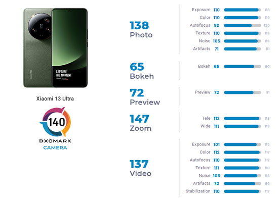 En ce qui concerne le Xiaomi 13 Ultra, DxOMark a apprécié la qualité d’image constante sur toute la plage de zoom ainsi que la balance des blancs jugée agréable et neutre aussi bien en photo qu’en vidéo. Le laboratoire a constaté une large plage dynamique en photo et un bon compromis texture-bruit dans la plupart des conditions de test. L’autofocus en vidéo est fluide et précis alors que les visages profitent d’une bonne exposition même en conditions nocturnes. Par contre, DxOMark a relevé un délai notable entre l’appui sur le bouton de déclenchement de la photo et la capture ainsi que des couleurs sursaturées en conditions extérieures. Quelques effets de halo en extérieur ont été constatés ainsi que des problèmes sur la balance de blancs et de transitions d’exposition parfois visible en vidéo.