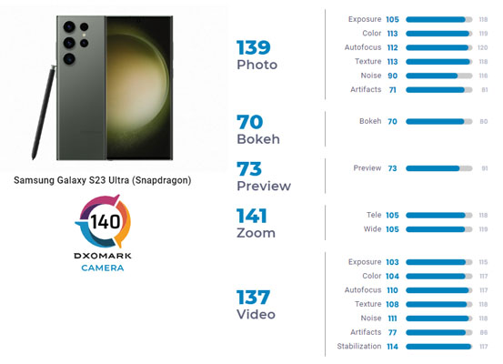 Le laboratoire DxOMark a pu évaluer les deux smartphones pour leurs capacités en photo ainsi qu’en vidéo. Les deux mobiles ont obtenu le même score : 140. Le Samsung Galaxy S23 Ultra a été apprécié pour le très bon niveau de détails ainsi que la large plage dynamique offerte, dans toutes les conditions. Le zoom est appréciable avec, là aussi, un bon niveau de détails. La stabilisation vidéo est très efficace et la mise au point automatique s’avère précise aussi bien en photo qu’en vidéo. Par contre, de faibles contrastes ont été relevés pour les scènes à contre-jour ainsi que la présence de bruit en basse lumière et en intérieur. Quelques légers reflets ont été observés ainsi qu’une sous-exposition occasionnelle des visages dans les vidéos en basse lumière.