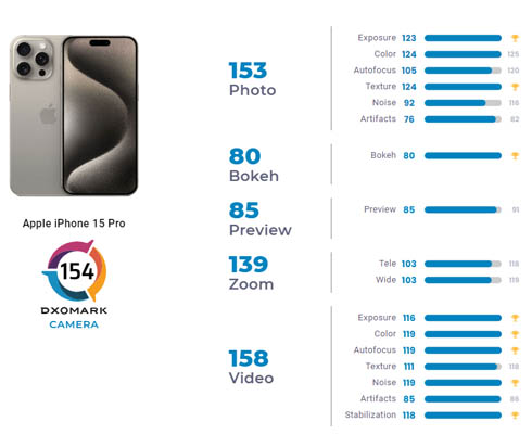 Il y a peu, l’iPhone 15 Pro Max était testé par le laboratoire DxOMark à travers une batterie de protocoles de tests poussés pour un bilan argumenté. Ce dernier a décroché un score de 154 contre 153 pour le Oppo Find X6 Pro et 156 pour le Huawei P60 Pro. Cela signifie que l’iPhone 15 Pro Max était second du classement des meilleurs photophones au monde. L’iPhone 15 Pro vient d’être testé, dans les mêmes conditions et, sans trop de surprise, obtient un score de 154, exactement comme la version Pro Max. Selon DxOMark, l’iPhone 15 Pro est donc exæquo avec l’iPhone 15 Pro Max, deuxième meilleur photophone au monde. Rappelons que les deux appareils proposent des configurations de capteurs identiques à la différence que la version Pro propose un zoom optique 3x contre du 5x sur le téléobjectif de 12 mégapixels, d’où la surprise relative.