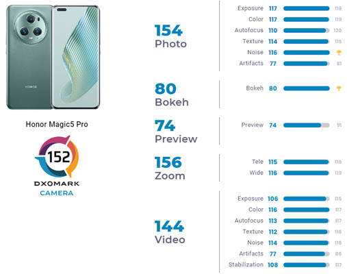 Le Honor Magic5 Pro propose d’excellentes performances pour son zoom. Il offre des clichés empreints d’une large plage dynamique avec de bons détails et un bruit faible. La mise au point automatique est rapide et précise ainsi que les couleurs et l’exposition. Pour les portraits, l’isolation du sujet est très bonne, selon DxOMark.