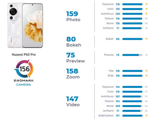 Le Huawei P60 Pro a été apprécié pour sa large plage dynamique pour les images de paysage et de portrait offrant un bon contraste dans toutes les conditions d’éclairage. DxOMark a aimé les couleurs agréables et vives proposées sur les photos ainsi que les bonnes couleurs en vidéo que l’on soit en intérieur ou en extérieur. La mise au point automatique est rapide et précise en mode photo et on profite d’une bonne profondeur de champ avec une netteté satisfaisante sur les visages notamment lorsqu’il y a un groupe avec des sujets sur différents plants. Le niveau du bruit est contrôlé et les détails élevés. Pour les photos en mode portrait, le sujet est bien isolé.