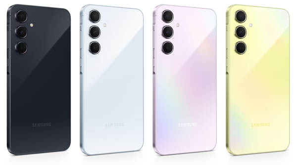 Les designs des Samsung Galaxy sélectionnés varient légèrement tout en restant fidèles à l'esthétique épurée de la marque. Le Galaxy S24 Ultra se distingue par son cadre en titane et ses options de couleurs oroginales (noir, gris, violet, ambre), et ses capteurs photo organisés de façon minimaliste. Le Galaxy S23 FE offre un cadre en plastique avec des coloris incluant le noir, vert, violet et blanc, tandis que le Galaxy A55 5G propose un dos en verre et un cadre métallique, avec des couleurs telles que bleu, lilas et lime. Les modèles Galaxy A25 5G et Galaxy A14 5G, plus abordables, présentent également un arrangement de capteurs simplifié sur un dos en plastique disponible en plusieurs couleurs, notamment bleu nuit et lavande. La majorité des modèles ont des profils plats, bien que l'A55 5G montre un léger effet bombé autour des boutons.