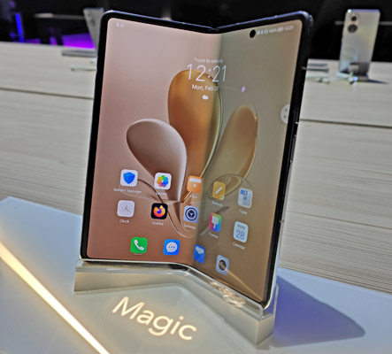 Le Magic Vs a la particularité d’être équipé de deux écrans. L’un est externe de 6,45 pouces AMOLED 120 Hz avec une luminosité de 1200 cd/m² et un côté incurvé tandis que l’autre est interne, pliant de 7,9 pouces AMOLED 90 Hz avec une luminosité de 800 cd/m². Les deux sont compatibles HDR10+. On peut commencer à consulter une application sur le premier et terminer sur l’autre, sans transition. C’est très pratique et l’écran interne offre un très grand confort pour le multimédia. Sinon, l’écran le plus remarquable est installé sur le Magic5 Pro. Celui-ci profite de plusieurs technologies de limite de la fatigue oculaire et propose une diagonale de 6,81 pouces avec 4 côtés incurvés et une fréquence de rafraîchissement pouvant varier entre 1 et 120 Hz, selon l’application en cours d’utilisation. Il est compatible HDR10+ et propose, selon Honor une luminosité de 1800 cd/m² pour en profiter en toutes circonstances.