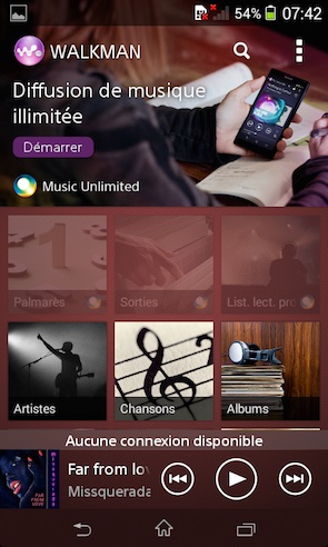 Sur la musique, le mobile se rattrape. Grâce à l'application Walkman et le bouton matériel dédié. Ce dernier s'utilise assez simplement : une pression longue pour lancer l'application Walkman, une courte pour lancer la lecture ou la stopper, deux courtes successives pour passer à la chanson suivante et une courte en agitant le mobile pour enclencher le shuffle. Point négatif : le bouton n'est compatible qu'avec l'application Walkman et non avec d'autres applications audio, comme Spotify.