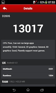 Selon le rapport d'AnTuTu, le vrai problème du Xperia E1 se situe sur le chipset, et plus particulièrement sur les deux coeurs Cortex-A7. Ce sont eux qui pourraient bloquer l?évolutivité du Xperia E1 et son adaptabilité vis-à-vis de vos besoins, en multimédia notamment.