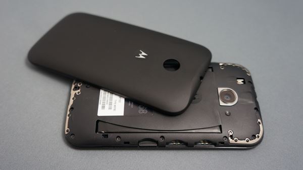 Un plastique mat et doux termine les tranches et se prolonge à l'arrière pour former le capot, amovible pour libérer l'accès aux emplacements microSIM (deux) et microSD. Il est également percé afin de libérer la prise jack ainsi qu'un petit micro sur le dessus et l'appareil photo à l'arrière, juste au-dessus du logo Motorola. Arrondi, il épouse parfaitement la paume de la main pour une préhension optimale. Seul défaut, il semblerait que Motorola ait mal fait ses calculs. Le capot est un peu grand et coulisse de haut en bas.