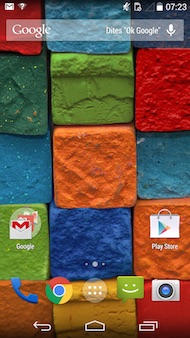 Une fois le smartphone allumé, nous nous retrouvons face à une interface bien connue, celle du Moto X, mais aussi celle du Nexus 6, voire même celle du Nexus 5. Bref : Android « stock » habillé du lanceur d'application Google Now Launcher. Quel plaisir de retrouver cette interface fluide, intelligente, débarrassée de nombreux ajouts parfois inutiles liés aux surcouches constructeurs ! Sur le panneau central, un dossier avec toutes les applications Google. À gauche, le panneau Google Now (également accessible avec un appui long sur la touche de navigation centrale). Et vos applications à droite, sur un panneau qui se crée automatiquement après le téléchargement de votre premier logiciel sur le Play Store.