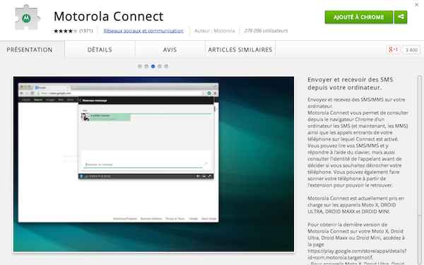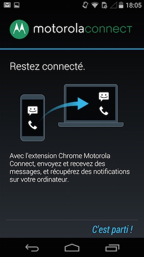 Le Moto X propose également d'autres petites fonctionnalités très actuelles. Tap And Pay, par exemple, pour payer vos courses sur un terminal de paiement NFC. La carte bancaire utilisée est celle enregistrée sur votre compte Play Store. Ou encore Motorola Connect qui fonctionne en corrélation avec une application Google Chrome (donc compatible Mac et PC). Elle sert à recevoir dans votre navigateur toutes les notifications de votre mobile, ou encore à envoyer et recevoir des SMS depuis un ordinateur. Vous avez également accès à quelques informations comme le niveau de la batterie et la force du signal réseau, sans le sortir de votre poche. Ca ne vous rappelle pas Continuity ? Bah, si !
