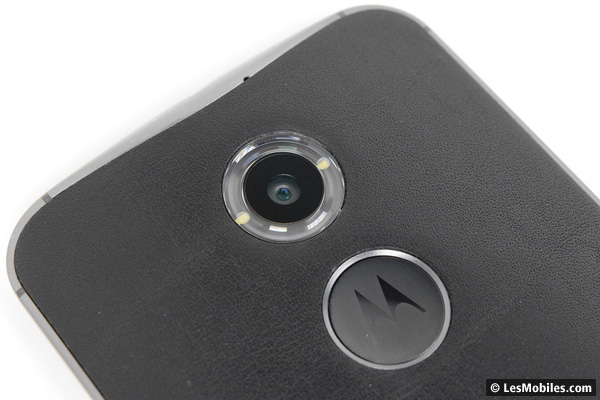 À l'arrière, nous retrouvons un dos très familier avec un logo concave, un capteur photo rond (ici entouré d'une bague où sont logées les deux diodes du flash) et cette courbure en haut si distinctive. Si l'année dernière, Moto Maker était indisponible en France, cette année, le service de personnalisation en ligne est bien là. La couleur du cercle entourant le logo, la couleur des haut-parleurs et naturellement la coque sont personnalisables. Pour cette dernière, vous choisissez la couleur, mais aussi le matériau. Notre modèle de test arborait un faux cuir du plus bel effet (meilleur que celui des Galaxy Note).