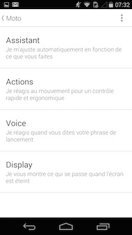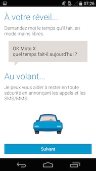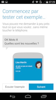 Parmi les ajouts de Motorola, les habituelles applications Moto Migrate, Moto Help et l'assistance Moto pour la configuration de l'assistance vocale. Mais nous avons rarement vu une interface Android aussi « vide ». Pour le test de ce Moto X, et pour faire la distinction avec le test du Moto G (2e Gen.), nous nous sommes concentrés sur la gestuelle et l'assistance vocale, qui sont toutes deux des apports Motorola introduit avec le premier Moto X et réintroduit ici. Pour résumer, le smartphone est actif quasiment tout le temps. Il est capable de répondre aux sollicitations grâce à une phrase clé, ici « Hello Moto X » (mais vous avez le choix). Une fois cela fait, il vous suffit de commencer avec elle chacune de vos sollicitations vocales. « Hello Moto X, quel temps fait-il aujourd?hui ? ».