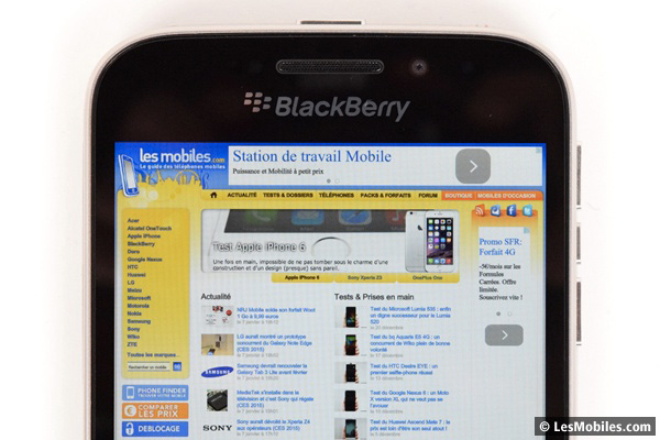 Revenons tout d'abord sur l'écran qui lui sert de support : une belle dalle de 3,5 pouces à la définition de 720 x 720 pixels. Vous reconnaîtrez là une définition HD rapportée au ratio 1:1 ou, autrement dit, à un format carré. Bien sûr, nous aurions préféré une dalle Full HD (1080 x 1080 pixels) sur un smartphone à plus de 400 ?, d'autant que cela n'aurait pas menacé la position de leader du Passport doté, lui, d'un affichage QHD mais elle n'existe pas chez BlackBerry. Et cela ne le gêne visiblement pas. Nous, un petit peu plus.