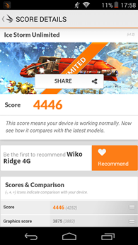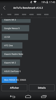 Comme toujours, nous avons lancé quelques benchmarks pour la forme. Le RIDGE 4G obtient environ 20000 points sur AnTuTu, environ 5000 sur 3DMark et environ 600 sur Benchmark OS II. Jusqu'ici, rien de bien surprenant.