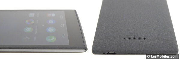 Le traitement du plastique rappelle également le travail de OnePlus. L'arrière est couvert d'une texture douce, presque feutrée, mais un peu plus douce que celle du One. L'aménagement est en revanche différent de ce côté. L'appareil photo occupe le coin supérieur gauche, avec un flash LED à sa droite. Le logo est centré un peu plus bas, tout comme le haut-parleur plus bas encore. Le capot est par ailleurs amovible et donne accès à un emplacement microSIM et un autre pouvant accueillir, au choix, une carte nanoSIM ou microSD mais pas à la batterie.
