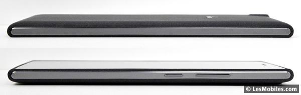 Du côté des tranches, le travail rappelle plutôt celui de huawei sur la gamme P avec des arrondis en haut et en bas et des bandes de plastique imitation métal incrustées de chaque côté. Les boutons (volume et alimention) sont à droite. Le port microUSB, en bas. La prise casque, à l'opposé. Bref, tout est là où il faut. L'ensemble est harmonieux et bien assemblé. Le capot tient bien en place et sa finesse/souplesse devrait l'aider à absorber les chocs pour y rester en cas de chute. Cela ne le protégera évidemment pas le Ridge 4G des déformations (bosses, rayures, etc) mais il a l'air solide et c'est déjà bien. D'autant qu'il est particulièrement léger pour sa taille.