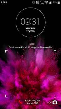 Nous retrouvons autrement l'écran de verrouillage avec l'horloge circulaire. Notez qu'il est également possible d'afficher l'heure en haut de l'écran lorsqu'il est éteint en effectuant un glissement vers le bas mais c'est plutôt lent. Vous aurez plus vite fait de tapoter deux fois pour sortir le smartphone de veille afin de vérifier l'heure. Il est évidemment aussi possible de paramétrer Knock Code pour arriver directement sur l'écran d'accueil en quelques frappes.