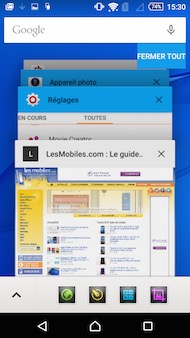 Le smartphone fonctionne sur Android 5.0 Lollipop avec une surcouche Xperia UI. Cette surcouche n'a pas subi de grands changements entre Jelly Bean, KitKat et Lollipop. La disposition des éléments de l'interface, les menus (application par exemple) et les paramétrages (accès au multitâche) sont restés identiques. Bien sûr, la zone de notification s'est adaptée à la charte graphique de Lollipop, ainsi que les touches de navigation virtuelles, mais c'est bien là les seuls indices qui nous le confirment.