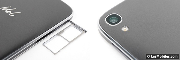 La disposition des connectiques est également assez classique mais c'est moins gênant. Le port microUSB se trouve ainsi en bas alors que la prise casque est à l'opposé. Un micro est également présent à chaque extrémité. Pas de grosses surprises à l'arrière, si ce n'est un effet brossé assez bien réalisé. Le capot n'est évidemment pas amovible. L'appareil photo et son flash occupent le coin supérieur gauche, ce qui risque de rendre son utilisation difficile en tenant le smartphone à l'envers dans certains cas mais les marques Idol et Alcatel OneTouch inscrites en-dessous vous aideront à retrouver le bon sens.