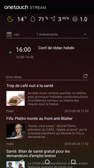 Un panneau OneTouch Stream est par ailleurs ajouté sur le bureau. C'est celui qui se trouve le plus à gauche. Il s'agit d'un agrégateur de news. Nous avons évidemment le souvenir du Blinkfeed de HTC. Il faut l'oublier. La solution d'Alcatel OneTouch est bien moins complète. Vous pourrez y retrouver la météo, les événements inscrits dans l'agenda ainsi qu'un flux de news mais il n'est visiblement pas possible de choisir une source. Il est également possible d'y afficher des papiers peints et les articles de la marque les plus vendus avec un lien pour les acheter à son tour mais nous ne voyons pas trop ce que cela vient faire dans un agrégateur de news...